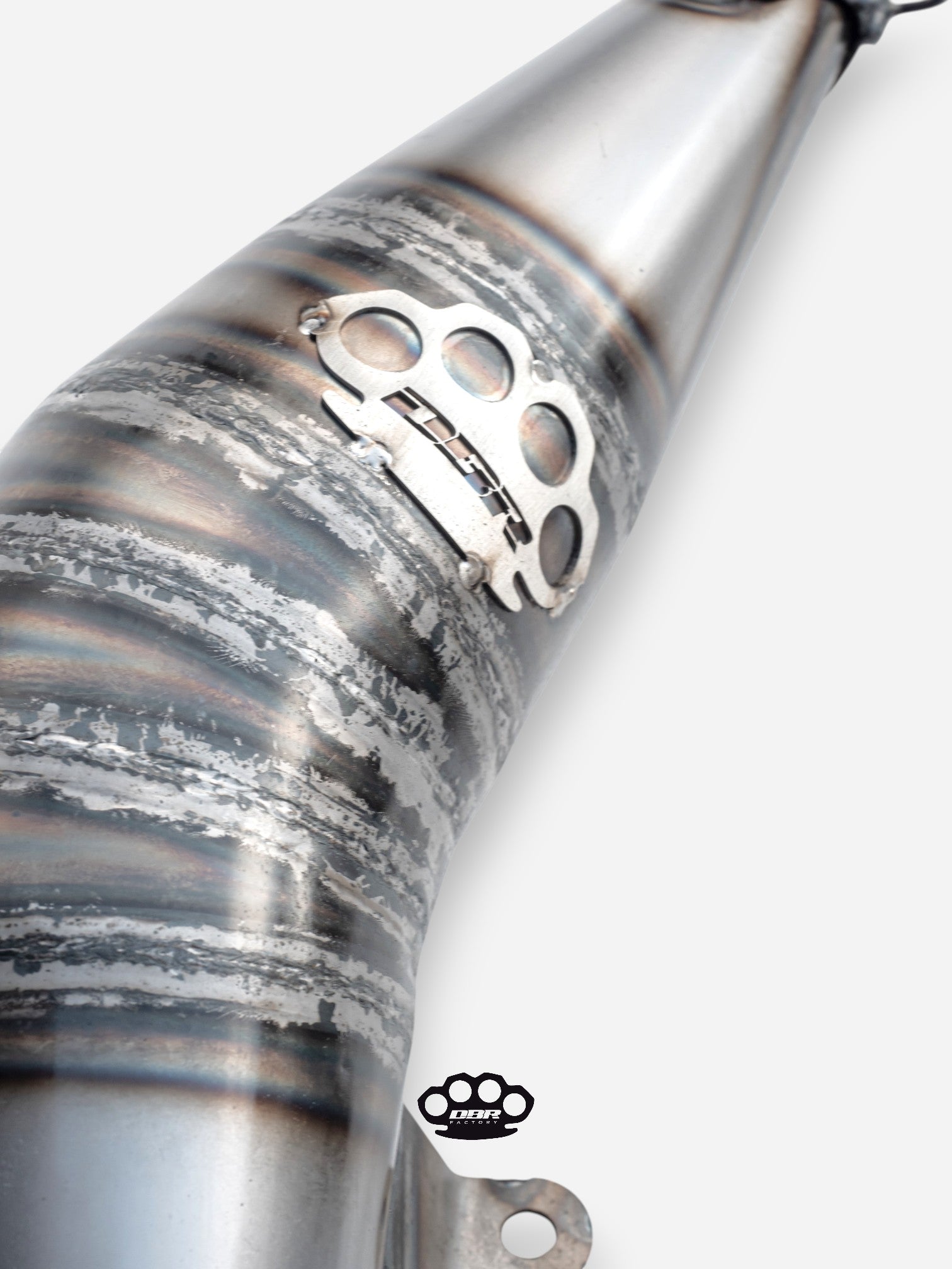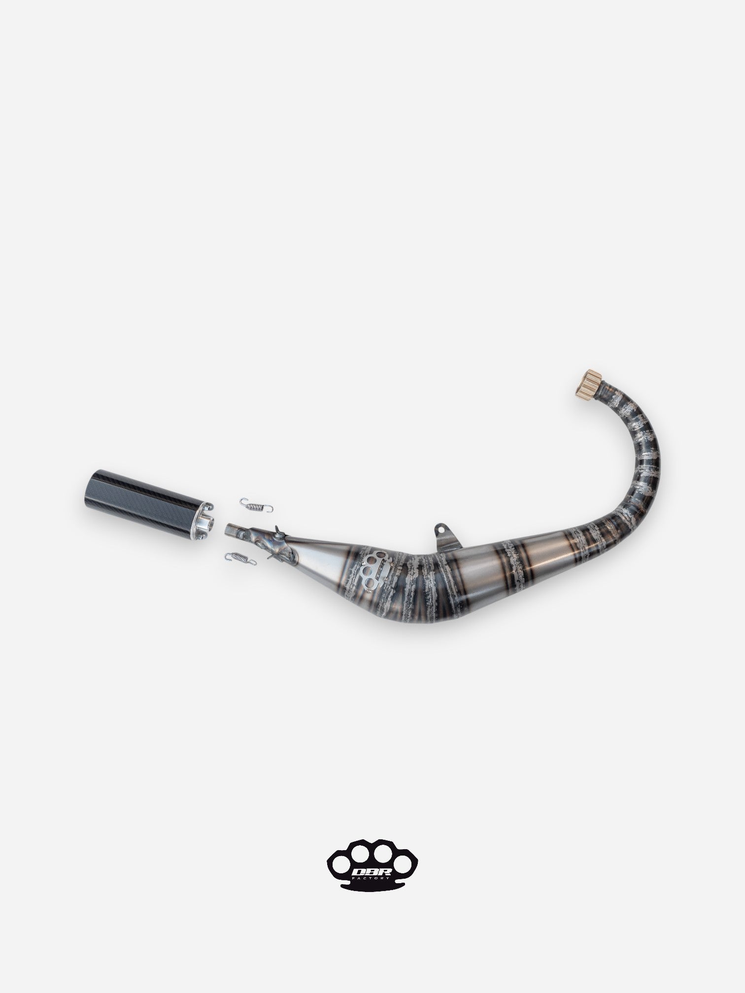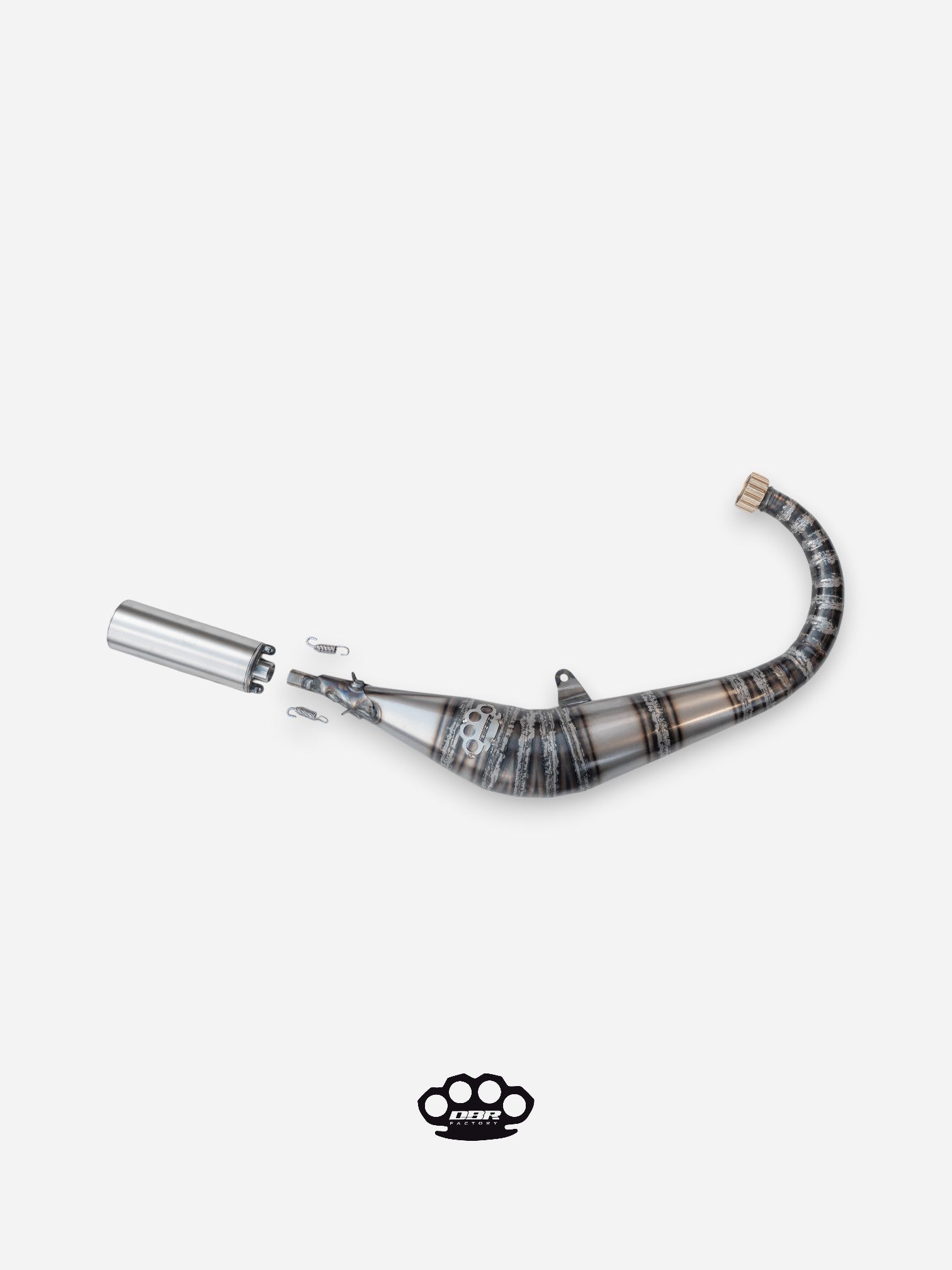 Si eliges el acabado Racing Raw, el escape está fabricado en hierro P04 sin tratar. Este material garantiza una resonancia superior, pero requiere un mantenimiento adecuado para preservar su integridad con el tiempo.
